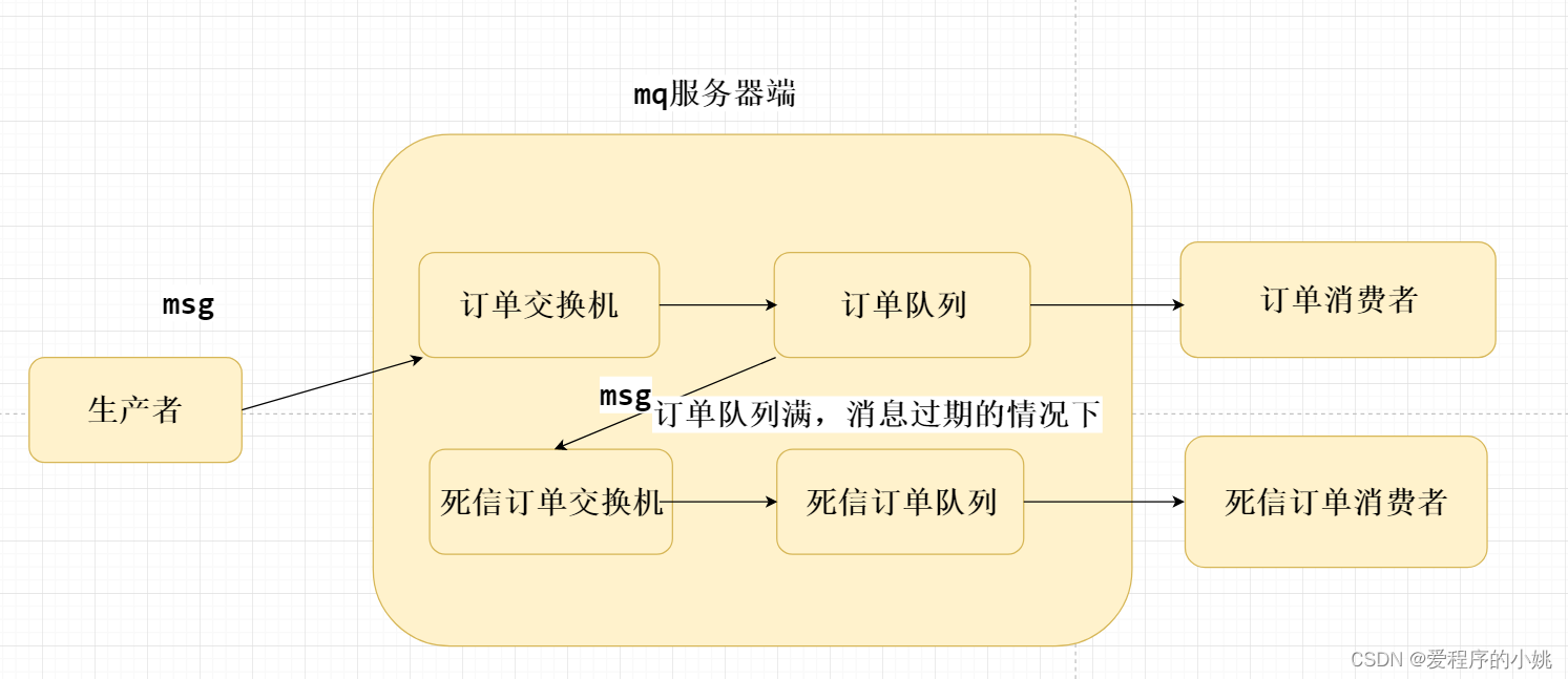 - 2.如果生产者投递消息到普通队列中,普通队列发现该消息一直没有被消费者消费的情况下,在这时候会将该消息转移到死信(备胎)交换机中,死信(备胎)交换机对应有自己独立的 死信(备胎)队列 对应独立死信(备胎)消费者。
