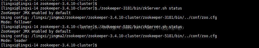 我们可以看到这时候zookeeper集群便正常的启动起来了,而且从通过./zkServer.sh status命令还可以查询zookeeper在集群中的角色,如leader、follower。