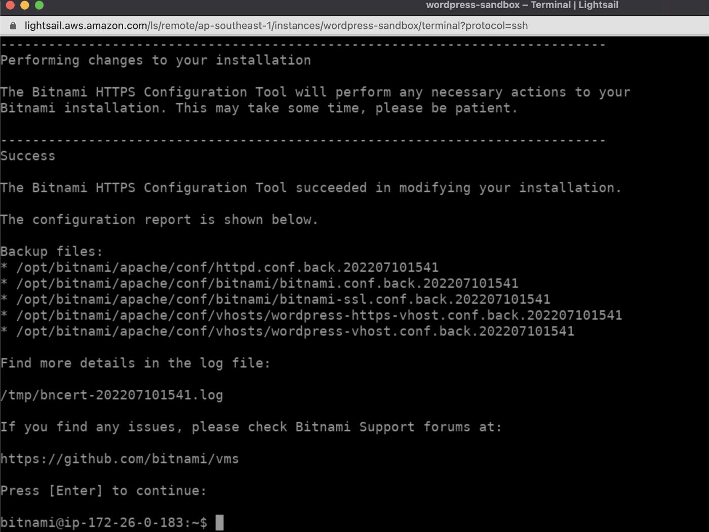 11. By default, wordpress run using http protocol. We can configure wordpress as secure website using https protocol with help from Bitnami HTTPS configuration tool (bncert). Please check the configuration details on this Enabling HTTPS on your WordPress instance in Amazon Lightsail documentation. I also have configured domain name used for this wordpress on my DNS server. Domain name that will be used is blog-sandbox.ludesdeveloper.com and www.blog-sandbox.ludesdeveloper.com. Domain name with www is needed by bncert configuration. Verify all instructions explained in documentation has been executed successfully.