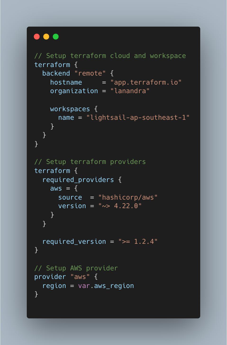 4. After creating the child module that is used for template Lightsail wordpress instance, the next step is to configure the Lightsail root module. I started by discussing file lightsail/lightsail-apse1/main.tf. In this file, I declared terraform configuration that refers to terraform cloud (app.terraform.io) as a remote backend. I also declared the organization and workspace used by Terraform code. Next in this file, I declared the provider used by Terraform code which is Hashicorp/AWS, and versions related to it. Last, I declared the AWS region used by Terraform code to refer to the variable aws_region that is configured in lightsail/lightsail-apse1/variables.tf which I will explain later.