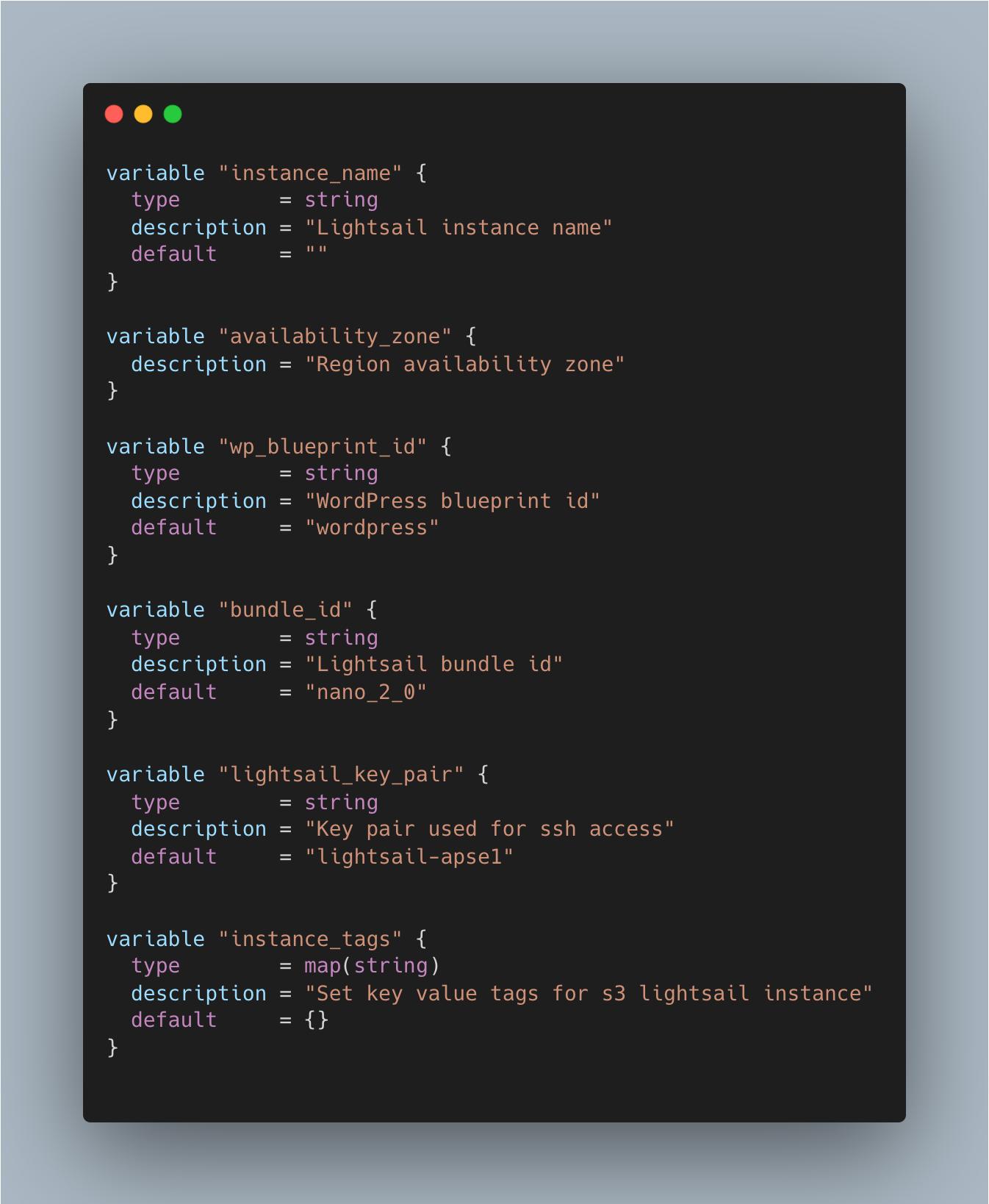 2. Next in file modules/lightsail/lightsail-apse1/wordpress/variables.tf, I defined variables mentioned in step 1. I defined default value in some variables, such as blueprint_id, bundle_id and key pair.