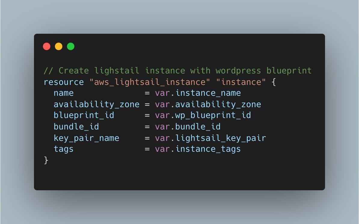 Lightsail resources will be provisioned based on the self-managed module that I created. In this module resided Lightsail WordPress configuration template and some other parameters.