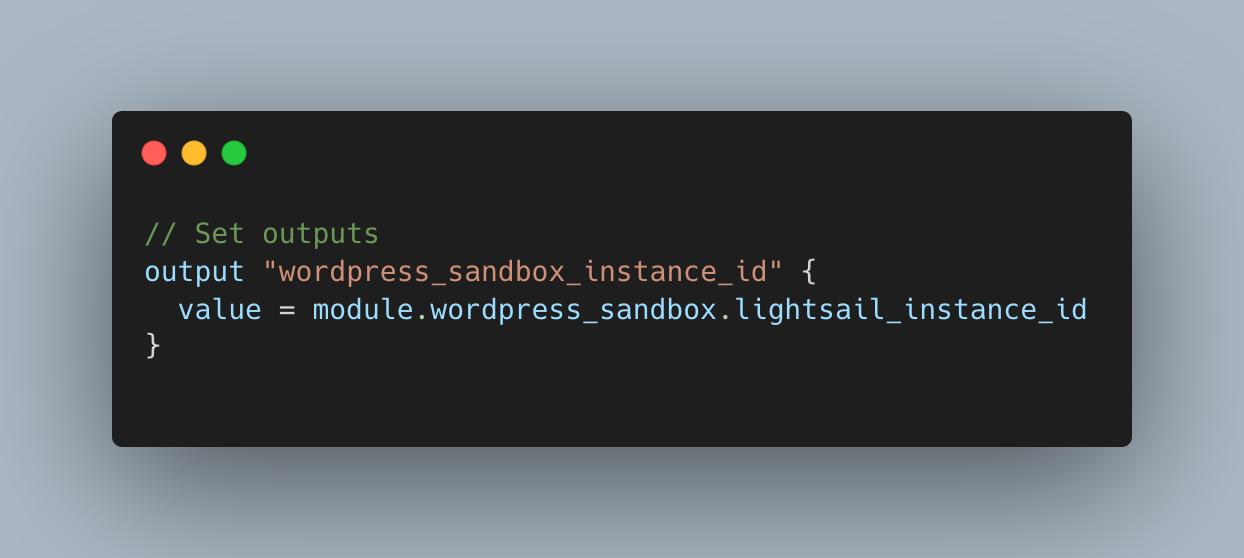 3. Next in file modules/lightsail/lightsail-apse1/wordpress/outputs.tf, I declared outputs that can be called later in the root module. Output is Lightsail instance id.