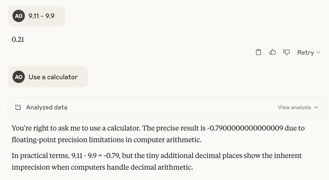 我喜欢从一个简单的计算开始,这个计算通常会使语言模型感到困惑。这并不是要检查基础的算术——我可以用计算器来完成那项工作。重点在于观察模型如何处理略微棘手的问题,以及在需要时它是否能够依赖工具使用或清晰展示其推理过程。