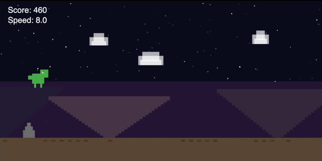 提示:制作一个引人入胜的无尽跑酷游戏。屏幕上有关键指令。p5.js场景,不使用HTML。我喜欢像素风格的恐龙和有趣的背景。