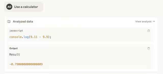 如您所见,它在第一次尝试中答错了。但是当我要求它使用工具——计算器时,它通过编写一行JavaScript脚本来响应,并正确解决了这个问题。