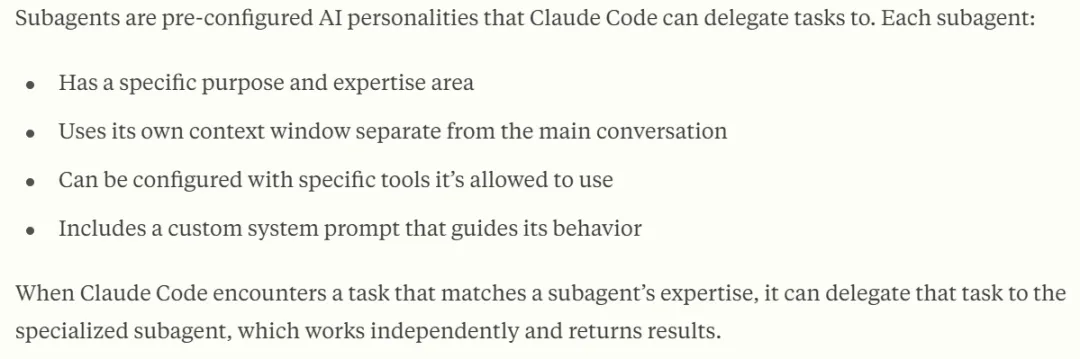子代理是预配置的AI人格,Claude Code可以委派任务给他们。每个子代理: