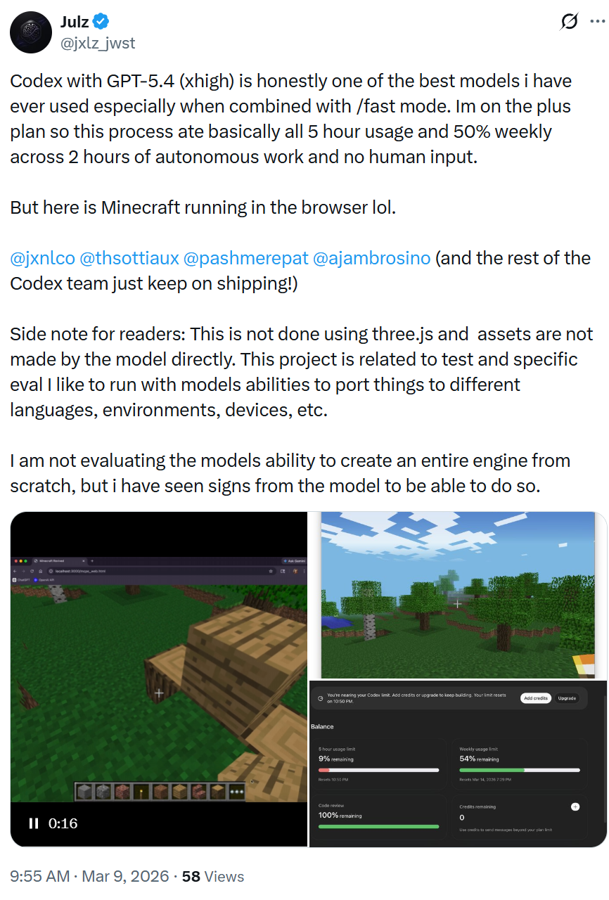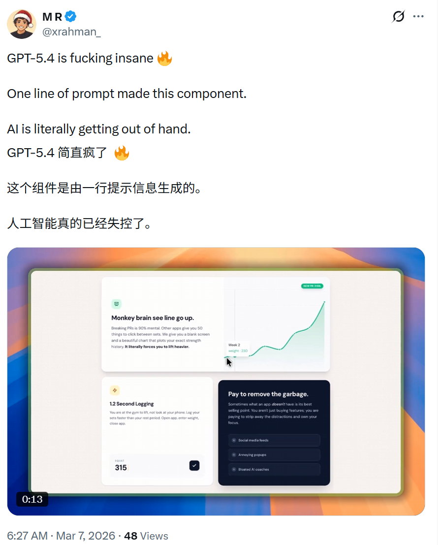 “GPT-5.4 在编程、知识工作、计算机使用等方面表现出色,看到大家如此喜欢它,我感到非常欣慰。但它也是我最喜欢与之交流的模型!我们之前在模型个性方面一直做得不够好,所以现在朝着正确的方向前进,感觉格外令人高兴。”