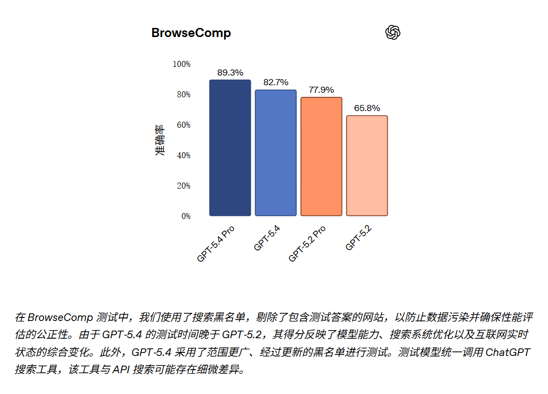 GPT-5.4 在智能体联网搜索(agentic web search)能力上显著领先。在 BrowseComp 基准(专门评估 AI 智能体通过多轮持久浏览网页、挖掘难找信息的表现)中,GPT-5.4 比 GPT-5.2 提升了 17 个百分点,达到 82.7%;而 GPT-5.4 Pro 更创下 89.3% 的新纪录,成为当前最强。