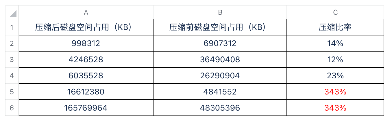 测试过程中还有个小插曲,下表反应了 TimescaleDB 的压缩比率,可以看到,TimescaleDB 在小数据规模的情况下,压缩比正常,但是在数据规模较大的场景四和场景五中,压缩以后的磁盘空间占用比例反而增大了 3.4 倍左右,疑似 bug。