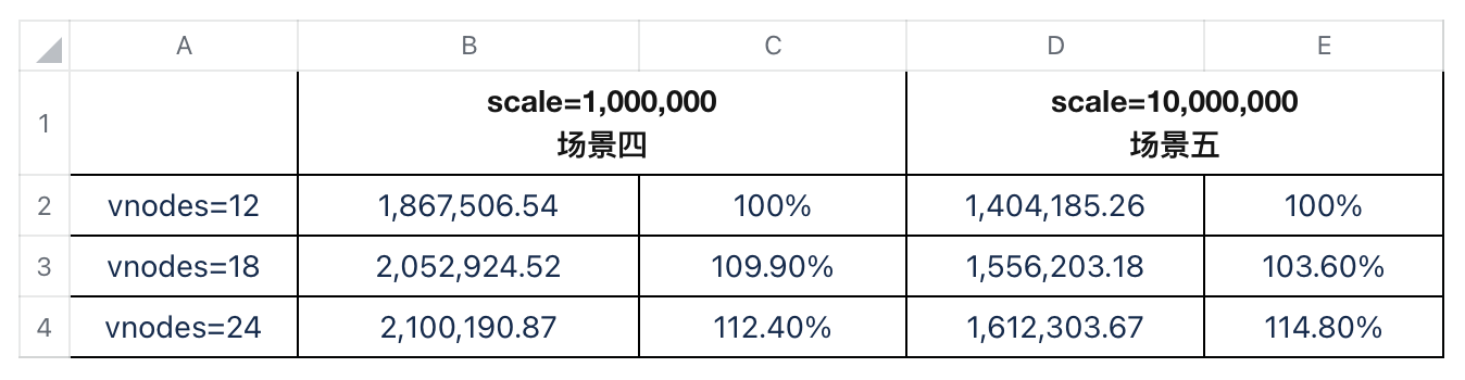 可以看到,在较多设备的场景(场景四、五)中,增加 vnodes 的数量 ,TDengine 写入性能提升明显。可见在不同规模的场景中,我们可以通过调整 TDengine虚拟节点的数量来获得更好的写入性能。