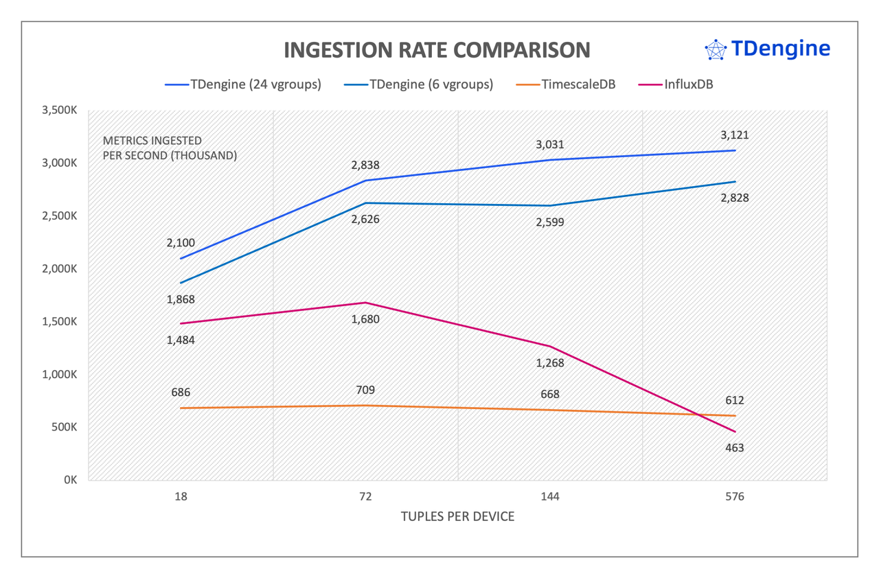 我们调整 vnodes 数量配置,同时测试两个不同 vnodes 数量情况下的写入性能指标。如上图所示,随着表中记录数的增加,vgroups=12 和 vgroups=24,TDengine 写入性能均呈现出持续增加的趋势。当设备记录数达到 576 行(此时数据集规模约等于 32,414,619 x 32 = 10.37 亿行数据记录),vgroups=12 时,写入性能达到 2,827,696.64 metrics/sec,性能均大幅领先 TimescaleDB 与 InfluxDB,是 TimescaleDB 的 6.1 倍, InfluxDB 的 4.6 倍。