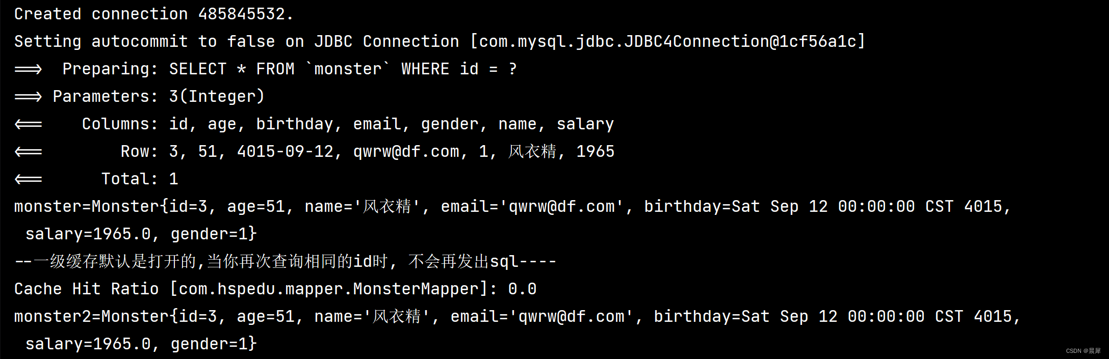 //当我们再次查询 id=3的Monster时,直接从一级缓存获取,不会再次发出sql