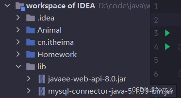 与此同时,打开IDEA开发工具,在当前项目目录下新建一个lib目录文件夹用来存放第三方jar包,这样做方便管理和引用。下载完之后将jar包放进lib文件夹中,像这样: