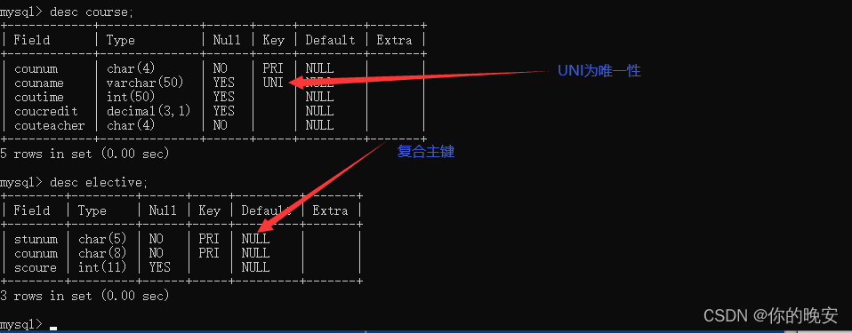 | 2 | couname | varchar(40) | YES | 唯一约束 | 课程名 |