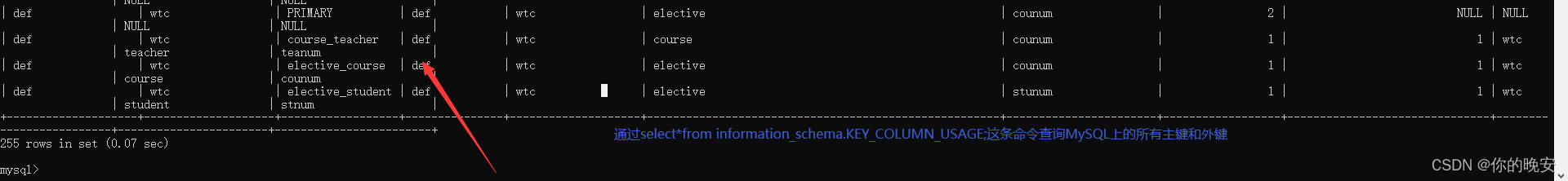 通过select*from information_schema.KEY_COLUMN_USAGE;这条命令查询数据库中所有表的外键和主键