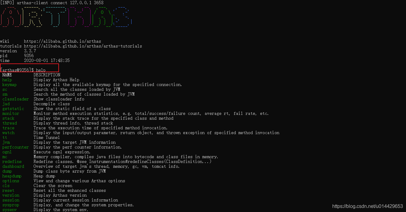 在arthas交互环境中,可以输入help命令,然后会出现所有arthas支持的命令