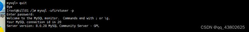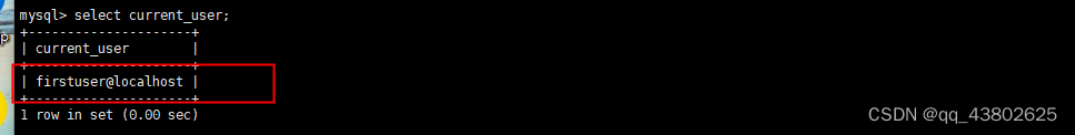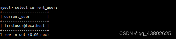 2、创建新用户:create user '用户名'@'localhost' identified by '123456';3、设置用户权限:grant all on *.* to 'firstuser'@'localhost';8.0之后的mysql不支持 授权的时候就进行用户创建,所以创建 之后才能授权;1、查看正在mysql登录状态的用户:select current_user;3、登录验证查