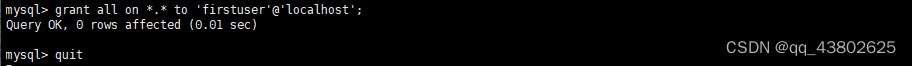 3、设置用户权限:grant all on *.* to 'firstuser'@'localhost';