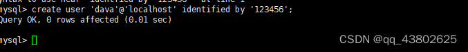 2、创建新用户:create user '用户名'@'localhost' identified by '123456';