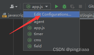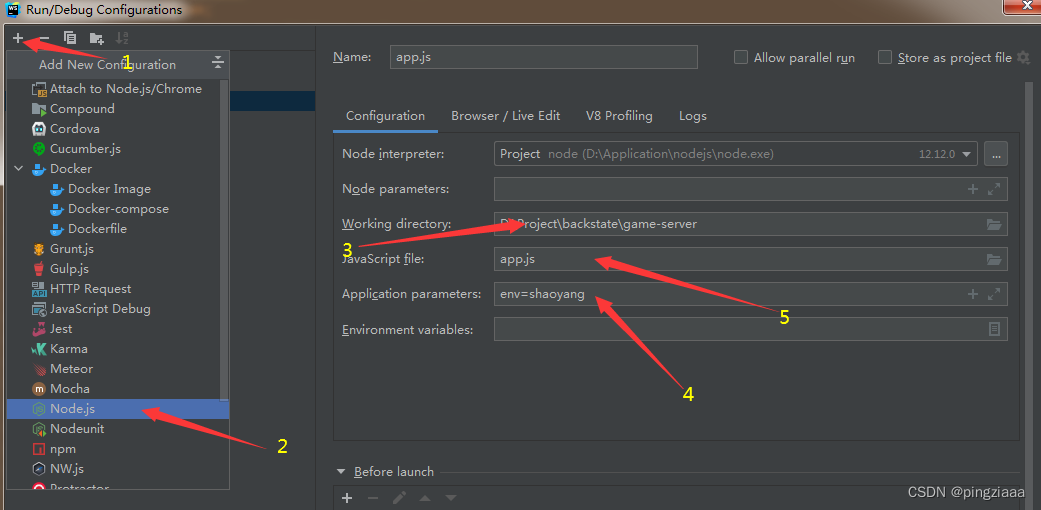 选择主目录下的app.js,是启动js。添加启动参数,该参数在代码中用到,linux系统使用的是环境变量,我们这里调试需要自己添加,根据这个参数启动的环境是不一样的。
