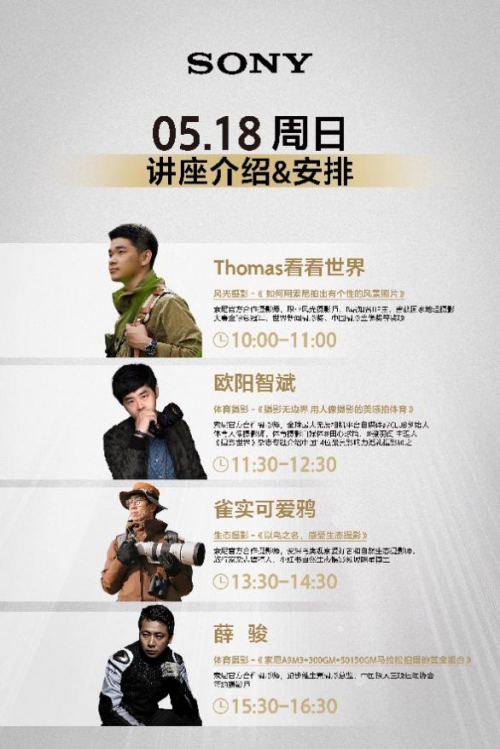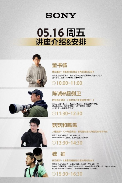 5月16日到19日上午,索尼还将在展台举办14场摄影师讲座和互动分享,邀请多位索尼官方合作摄影师亲临现场,围绕人像、生态、体育、航空等不同题材,深入讲解实战拍摄经验,为现场影友在未来创作中提供更多灵感,启发更多影像表达的可能。