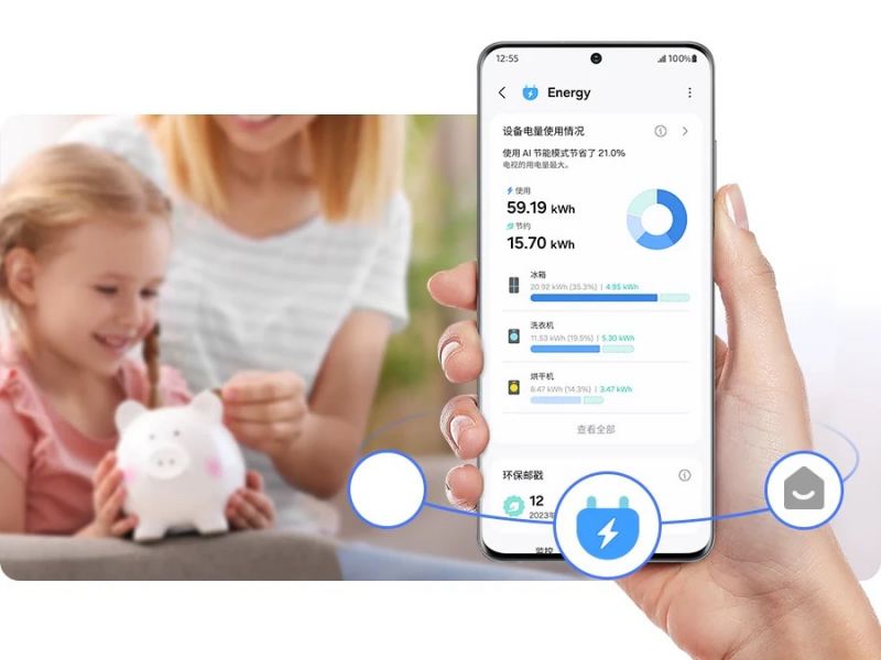 冰箱作为家中唯一24小时无休的高强度运作家电,尤其是拥有如此丰富多彩智慧功能的AI冰箱,其能耗情况自然成为用户心中密切关注的细节之一。用户可以通过手机SmartThings开启三星独有的AI节能模式,冰箱将根据使用习惯和周围环境智能优化压缩机效率和除霜周期,实现更加高效节能的储鲜体验。在“每日用电量”界面,用户还可随时查看每小时、每日、每周和每月的耗电情况,并可查询AI节能模式下冰箱节省的电量,真正做到用电情况透明有数,切实节省家庭的用电支出。