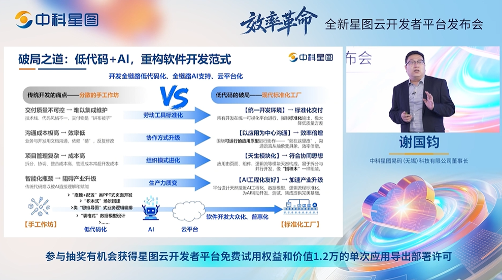 一款优秀产品要拥有对行业痛点的深刻洞察,也离不开对技术创新的持续探索。在本次发布会上,中科星图易码(无锡)科技有限公司董事长谢国钧作《效率革命,低码破局》主题演讲,系统阐述了GEOVIS DevMate星图云开发者平台背后的研发理念与现实意义。