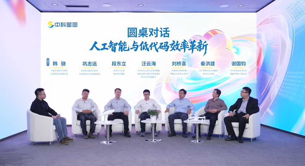在“人工智能与低代码效率革新”圆桌对话环节,七位来自学界与业界的嘉宾围绕低代码技术与人工智能融合发展趋势、落地挑战与行业前景等议题展开深度交流,并与线上观众在线互动。对话的嘉宾包括:汪云海、段东立、刘桥喜、秦洪建,中科星图易码(无锡)科技有限公司董事长谢国钧、高级副总裁巩志远、副总裁韩骁。