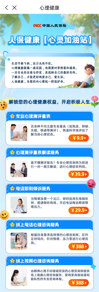 近日,有用户发现,中国人保APP在其首页“健康商城”板块中,悄然上线了名为“心灵加油站”的心理健康服务专区。