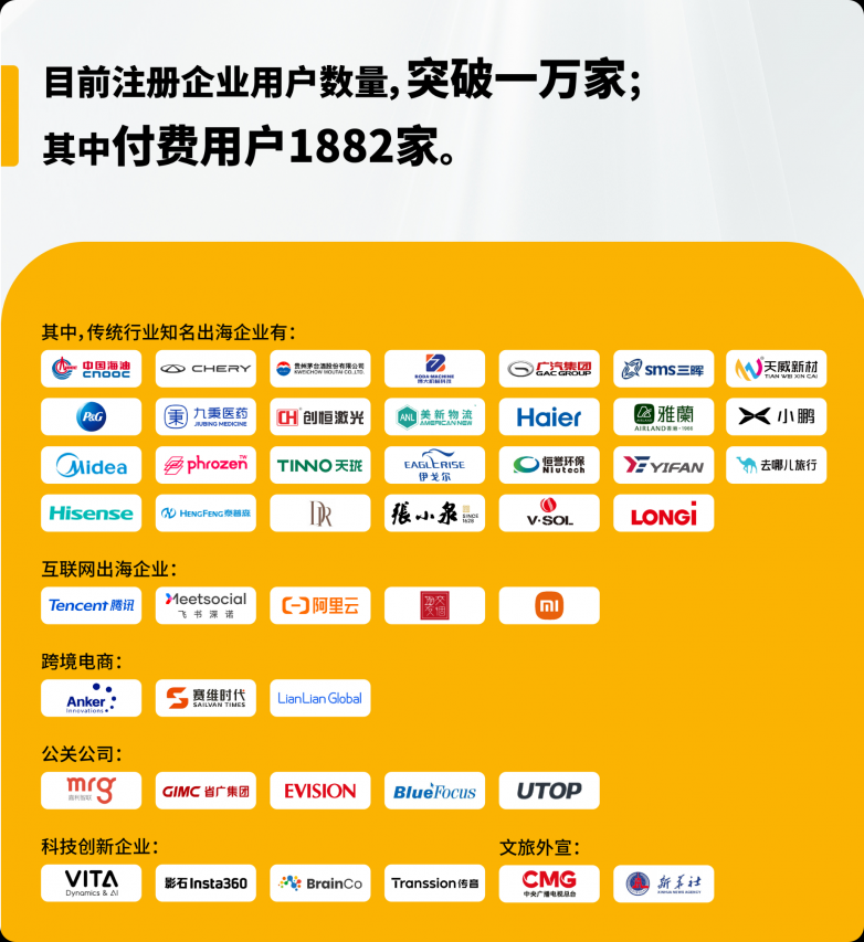 其中,众多中国知名出海企业已入驻使用,包括:中国海油、奇瑞汽车、贵州茅台、广汽集团、美的集团、海尔集团、青岛海信、隆基绿能、小鹏汽车、张小泉股份等。