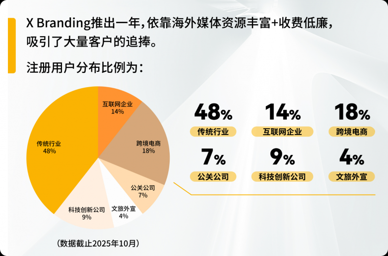 数据显示,X Branding注册企业用户覆盖多个行业:- 传统行业占比 48%- 互联网企业占比 14%- 跨境电商占比 18%- 公关公司占比 7%- 科技创新公司占比 9%- 文旅与外宣单位占比 4%
