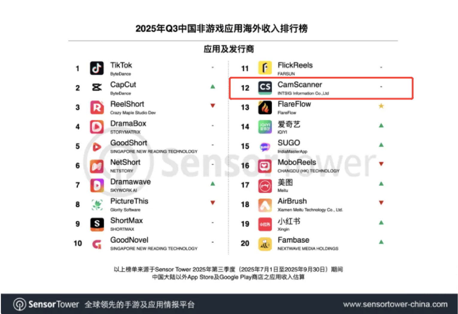 图说:扫描全能王位列《2025年Q3中国非游戏应用海外收入排行榜》第12位