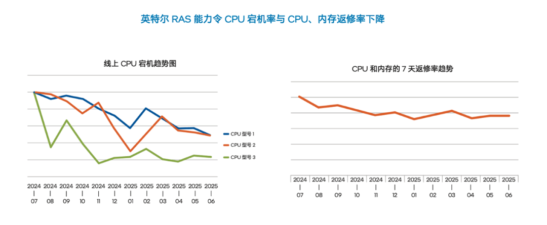 至强®6这“三高“能力叠加起来,就构成了目前AI服务器/集群机头或主控领域独一份的控场稳盘能力。有国内某头部AI大厂的实践证明,通过综合应用至强这些RAS能力,CPU造成的宕机率已被降低了50%,二次返修率也显著下降,让其服务器的投资有了更优的回报。
