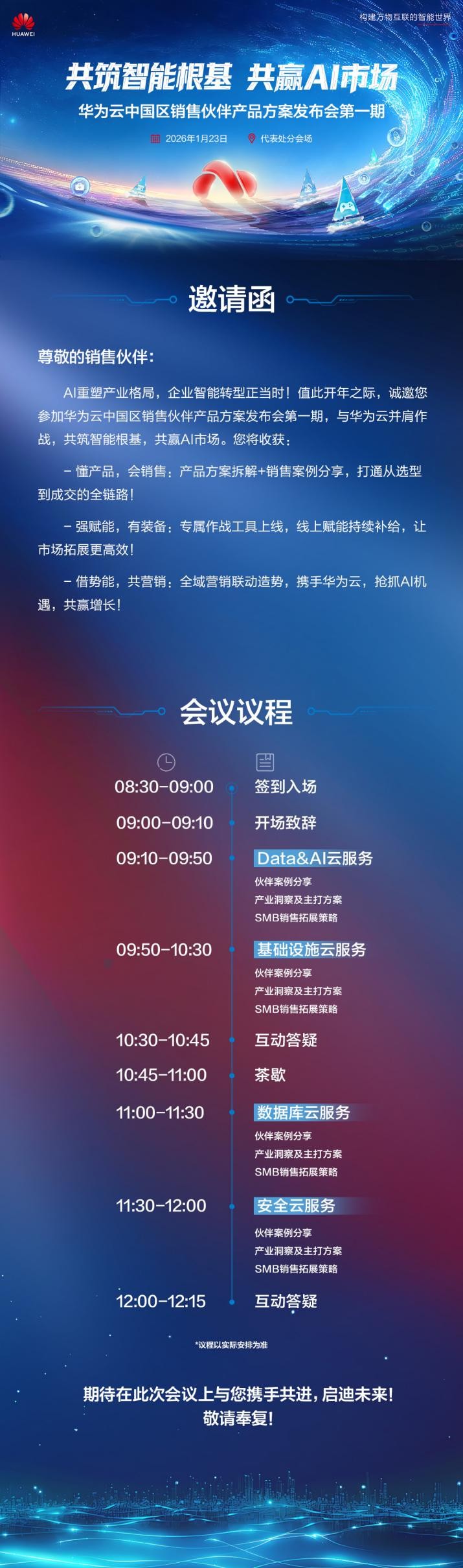 答案,就蕴藏在即将到来的这场深度对话之中。我们深知,伙伴需要的不是遥远的技术蓝图,而是触手可及的增长路径;不是单向的产品宣讲,而是双向的能力共建。因此,本次“华为云中国区销售伙伴产品方案发布会”应运而生。它不仅仅是一场发布会,更是一次面向2026年AI市场的实战部署会、一次面向伙伴核心竞争力的赋能升级会。华为云希望与伙伴一起,拆解复杂、沉淀方法、形成共识,在AI商业化“下半场”中抓住确定性增长机会。