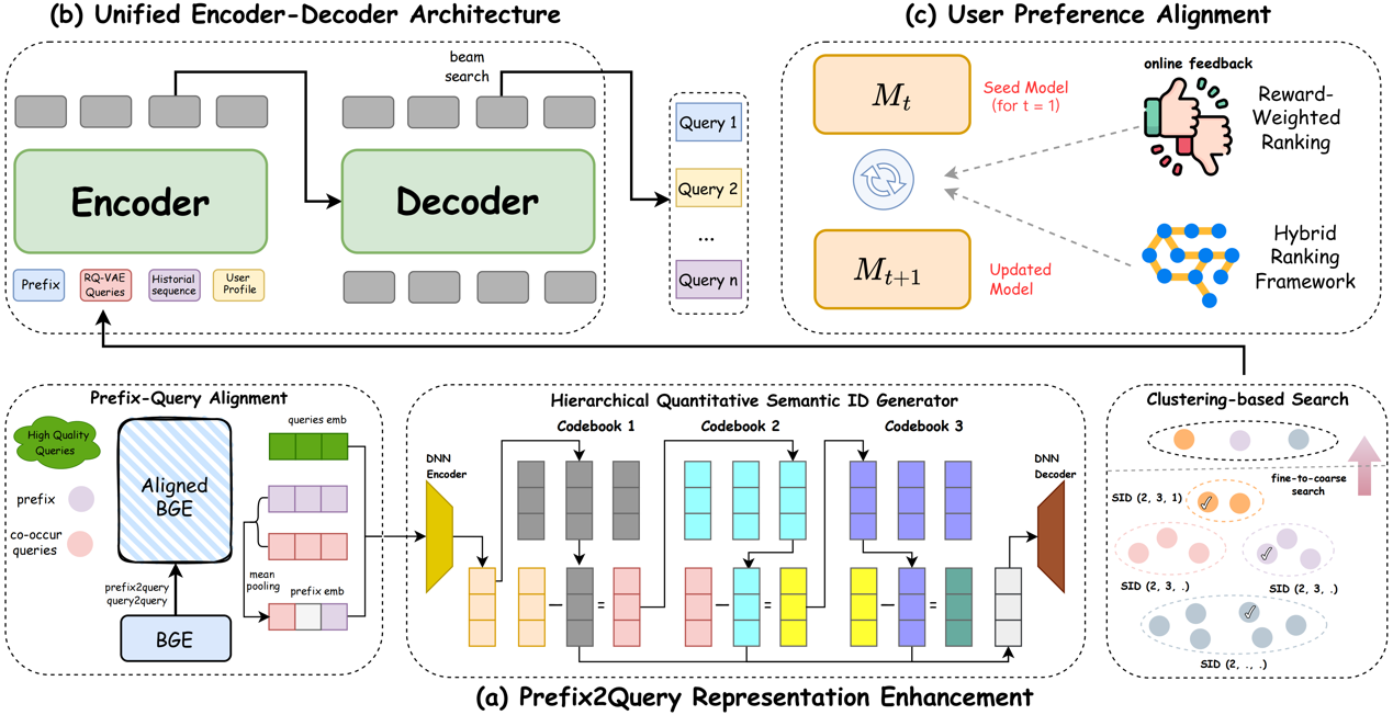 查询推荐(Query Suggestion)是现代电商搜索系统中的关键功能,通过在用户输入过程中实时推荐相关查询,帮助用户快速明确意图,提升搜索体验与转化效率。传统方法通常采用多阶段级联架构(MCA),虽然在效率与效果之间取得了一定平衡,但由于各阶段目标不一致、长尾查询召回困难等问题,限制了系统性能的进一步突破。
