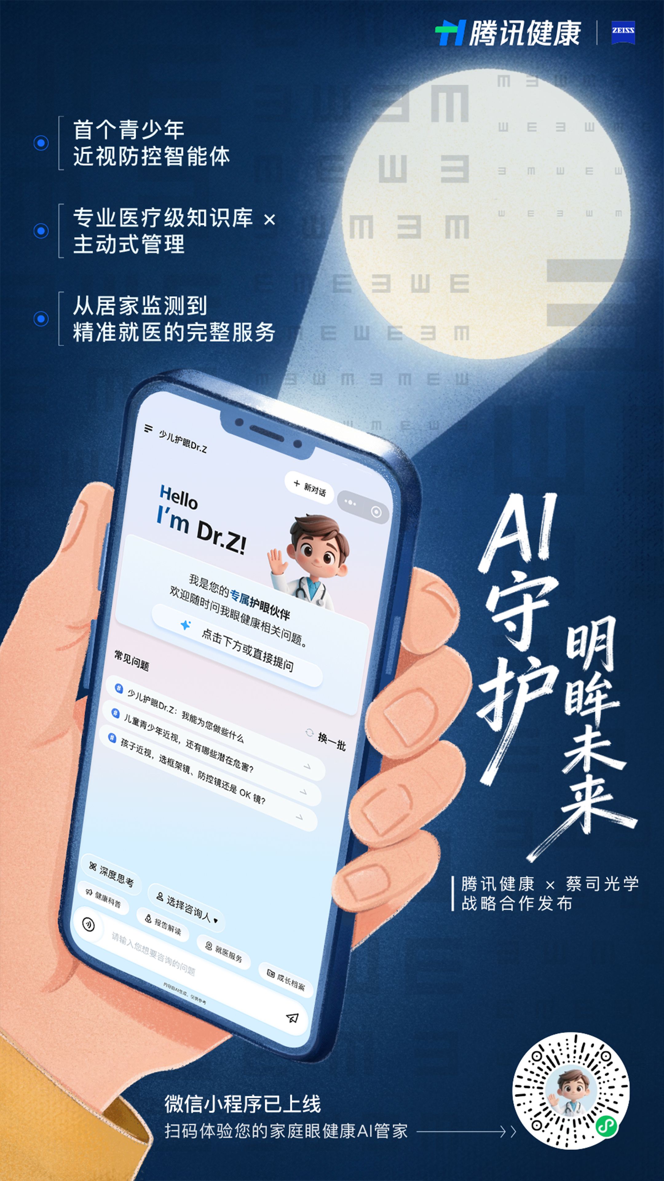 1月29日,随着全国大中小学陆续进入寒假,视力检查与近视防控需求迎来年度高峰。腾讯健康与全球光学行业领导者蔡司光学宣布达成战略合作,正式推出“少儿护眼Dr.Z”智能体。