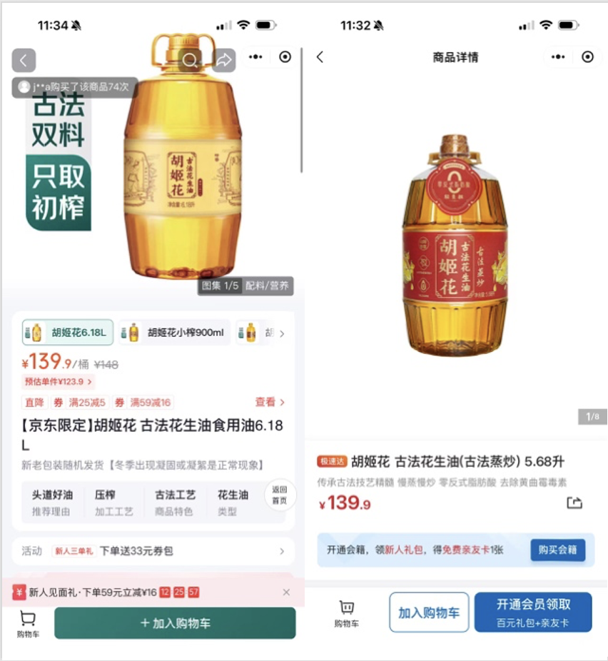 在米面粮油这类民生商品上,记者也发现,有时候虽然价格相同,但七鲜会通过不同规格达到更高的性价比。如胡姬花古法花生油,七鲜和山姆两家标价同为139.9元,但七鲜的容量是6.18升,山姆则是5.68升。对于精打细算的顾客来说,这样的规格差异也会决定最终的的消费选择。