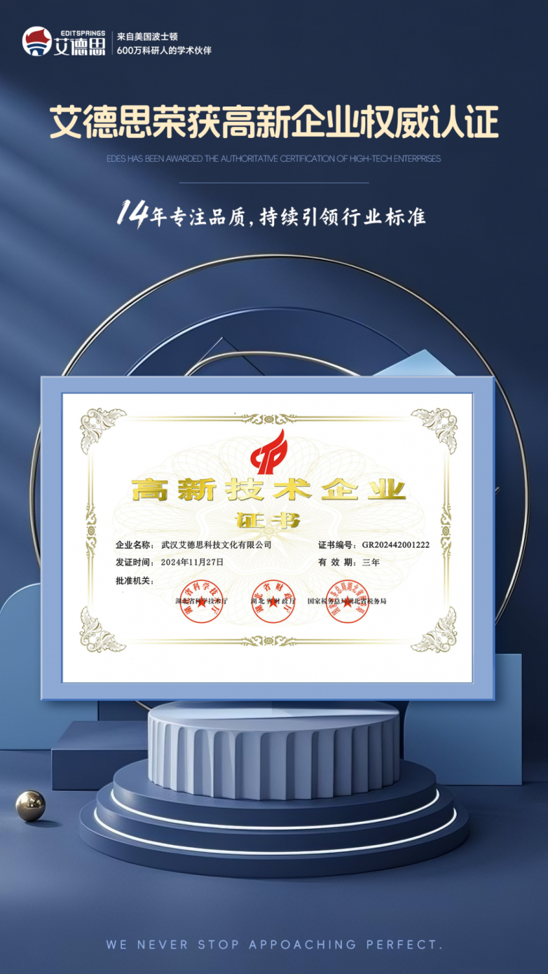 艾德思于2024年11月荣获“高新技术企业”官方认定,在全国学术服务机构中首屈一指。