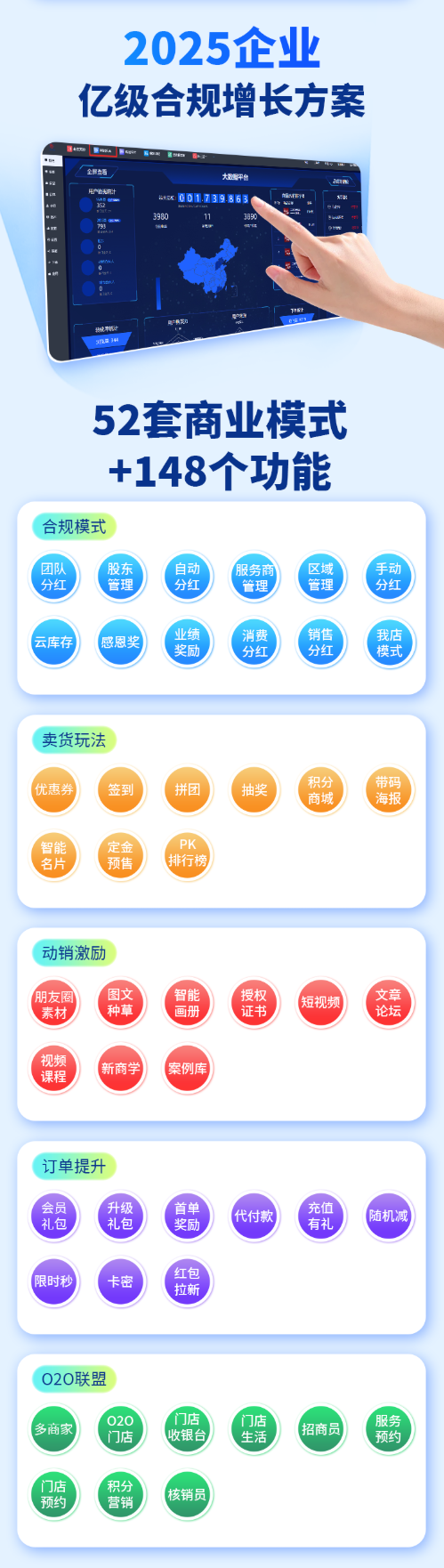 合规模式:团队分红、股东管理、自动分红、服务商管理、区域管理、手动分红、云库存、感恩奖、业绩奖励、消费分红、销售分红、我点模式