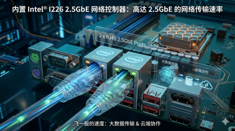 内置Intel® I226-LM和I226-V 2.5GbE网络控制器,提供两个RJ45网络端口,实现高达2.5GbE的网络传输速率。无论是大数据传输还是云端协作,都能享受飞一般的速度。