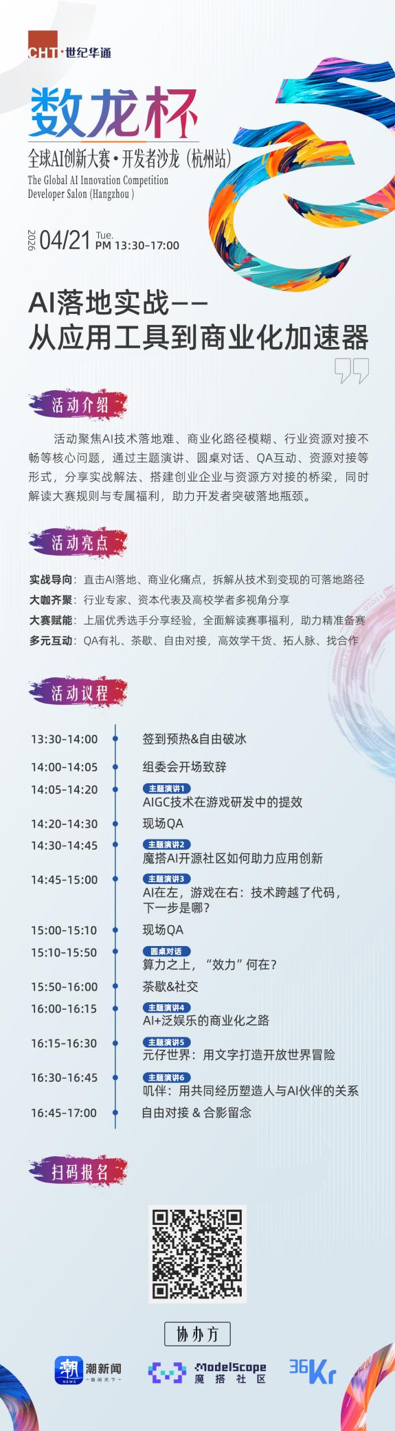 本次沙龙由世纪华通发起,联合潮新闻、魔搭社区和36氪共同举办,以“AI落地实战——从应用工具到商业化加速器”为主题,聚焦AI落地实战、商业化路径与大赛参赛赋能,汇聚行业大咖、技术专家、投资机构与优质开发者,全方位拆解AI落地难题、解读大赛福利、搭建企业与开发者对接桥梁。