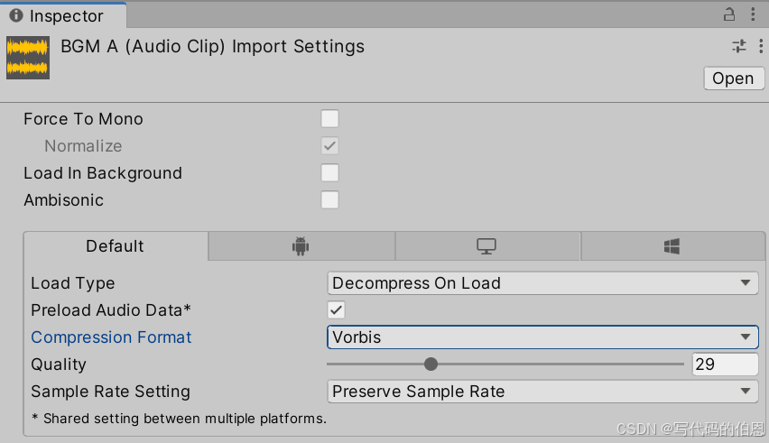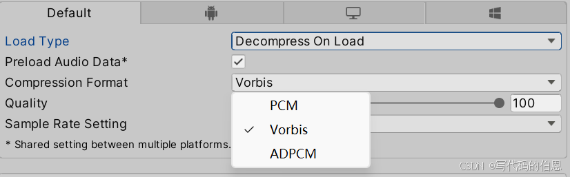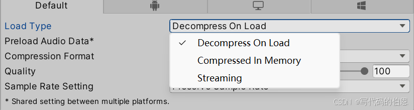 | Decompress on Load | 导入时解压,加载后常驻内存(音质最好) | 短音效(<2 秒)、高频播放的音频 |