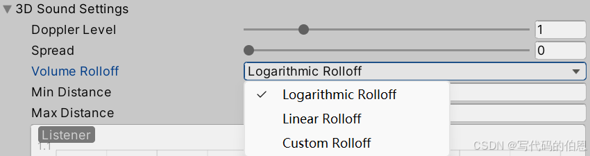 | Rolloff Mode | 3D 音频衰减模式(Logarithmic/Linear/Custom) | 自定义音量随距离衰减的曲线 |