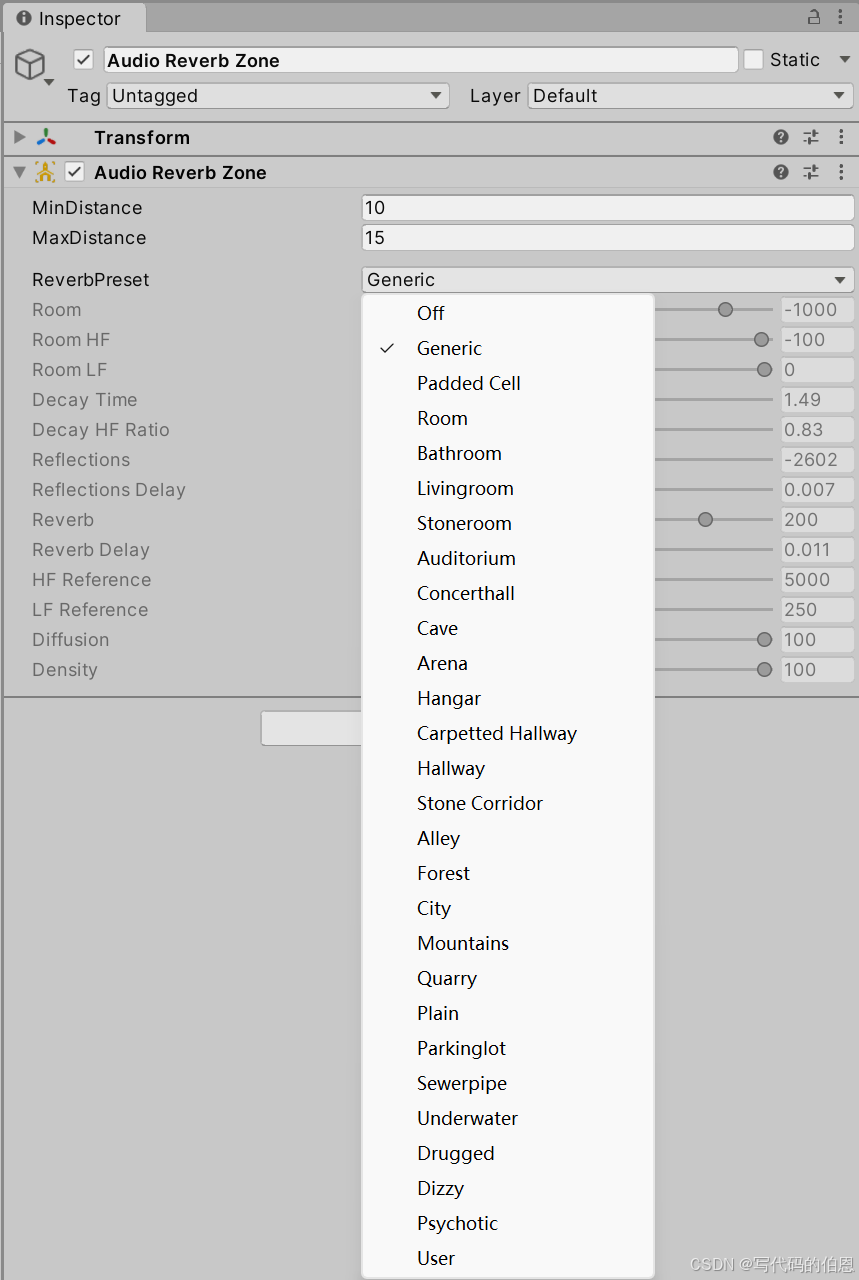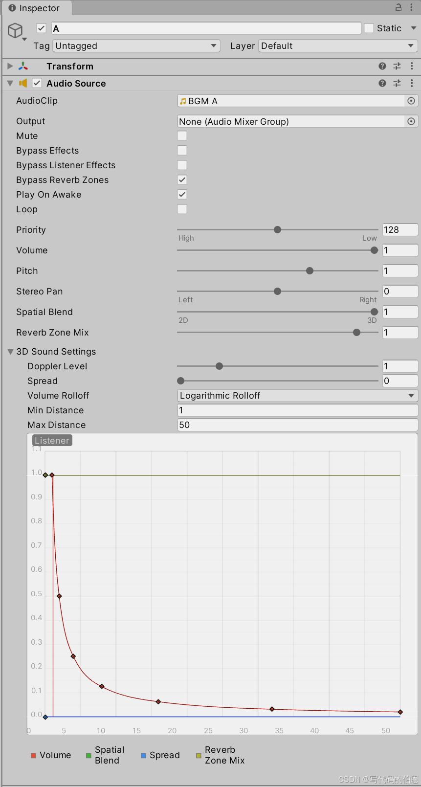 - 仅当AudioSource 的Spatial Blend = 1时生效,用于配置 3D 音频的空间特性(衰减、多普勒、扩散等),与 AudioSource 面板的参数一致(导入时设置为「默认值」,运行时可通过代码修改)。
