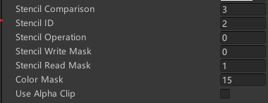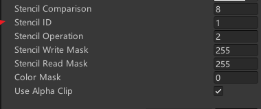 ID相等才渲染,它的ID和Mask相同,和默认材质不同,所以只在Mask区域渲染。它不改变缓冲区,可以预测再来一个子对象会覆盖它。