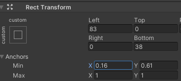 选择中间的9种单锚点模式时,anchorMax和anchorMin一样,是此锚点在父物体里的归一化坐标。选择6种双锚点模式和4锚点模式时,anchorMin是偏左下的锚点的归一化坐标,anchorMax是偏右上的锚点的归一化坐标。