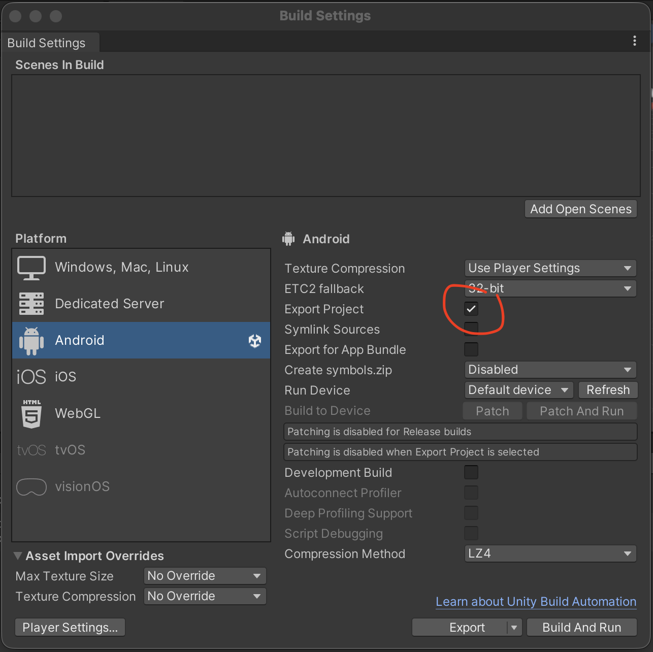 Unity -> Build Settings -> Export Project 复选框 -> 点击 Export