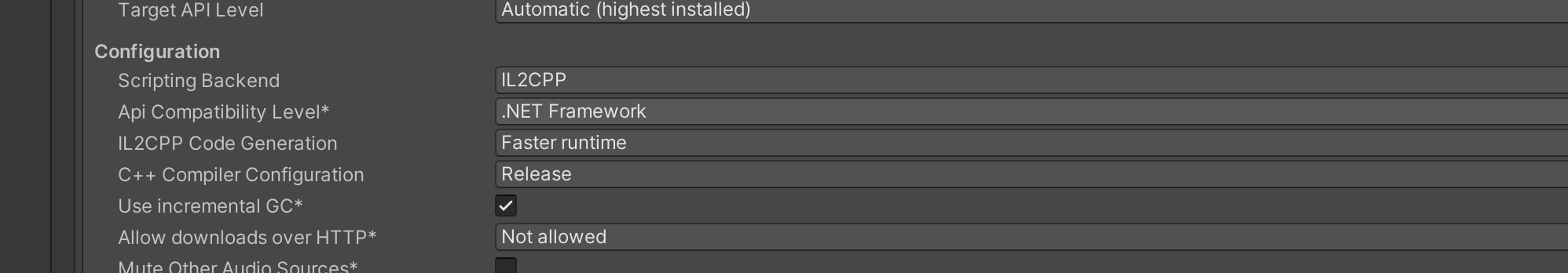 项目配置:Unity -> Project Settings -> Android 平台 -> Configuration -> Scripting Backend 修改为IL2CPP