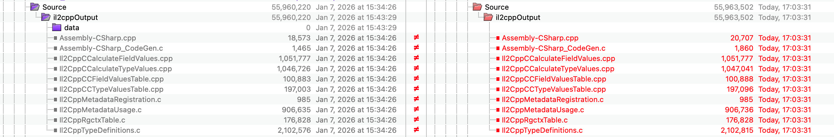 unityLibrary/src/main/Il2CppOutputProject/Source/il2cppOutput cpp文件变化如下